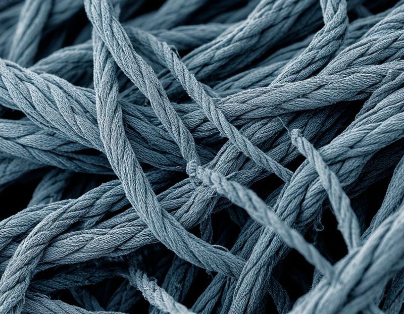 Смесь Хлопок/Полиэстер (65/35, 50/50): под микроскопом будут отчетливо видны ленточные скрученные волокна хлопка и гладкие цилиндрические волокна полиэстера. Задача — оценить их примерное количественное соотношение в нити.