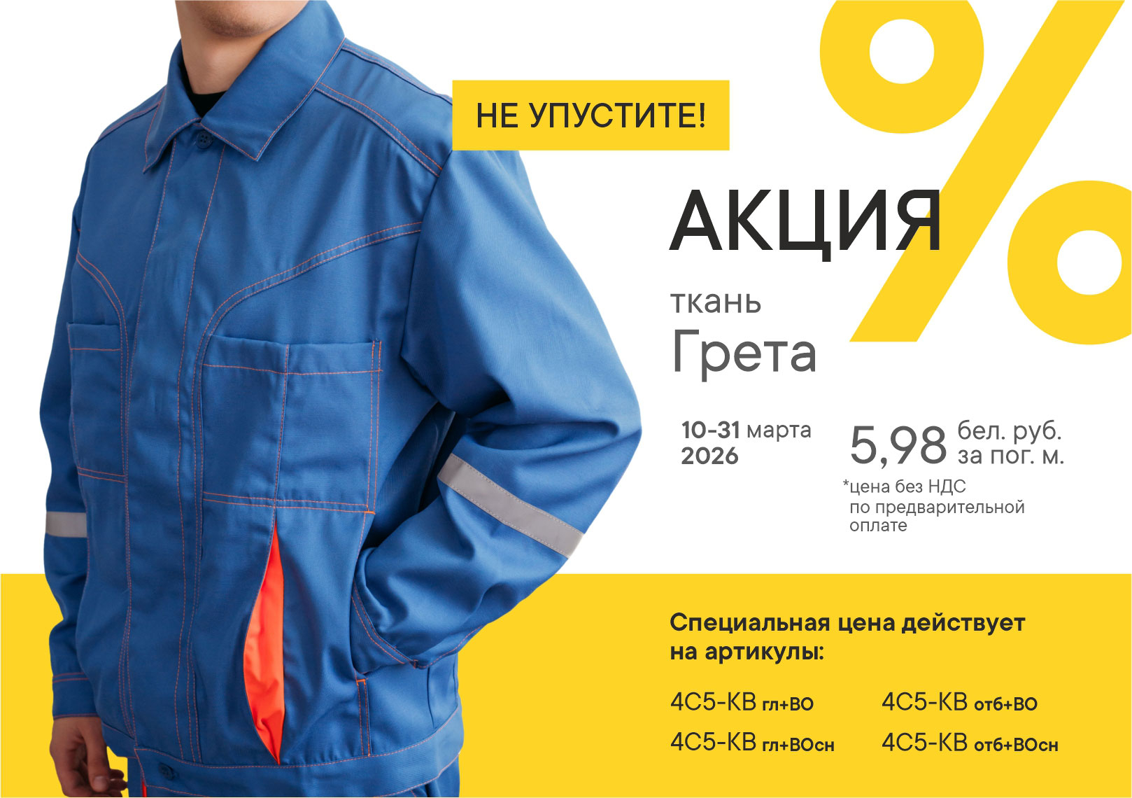 С 10 по 31 марта 2026 г. компания проводит акцию на ткань «Грета» - всего 5,98 бел. руб. за погонный метр (цена без НДС, по предварительной оплате). Скидки действую на следующие артикулы: