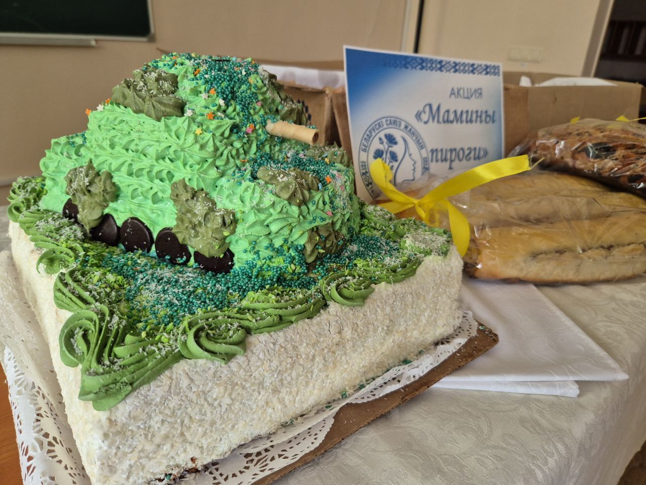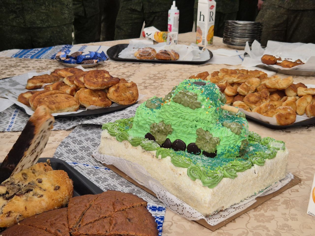 Инициаторами этого доброго дела стал женский коллектив ОАО "Моготекс" и члены ПО ОО "БСЖ". Женщины с любовью и старанием испекли множество ароматных пирогов и аппетитный торт в виде танка, чтобы порадовать военнослужащих.