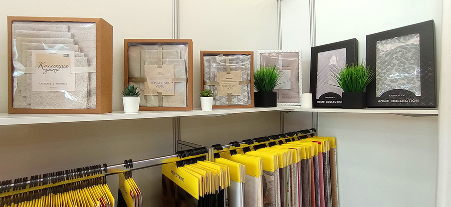 На своем стенде компания «Моготекс» экспонирует ассортимент тканей как для специального назначения, так и для оформления интерьера. Из инноваций представлены полотна постельного белья из волокна «Лиоцелл», в разной цветовой гамме ткань Blackout, полиэфирная ткань для портьер с уникальной структурой блестящей нити «Трилобал».
