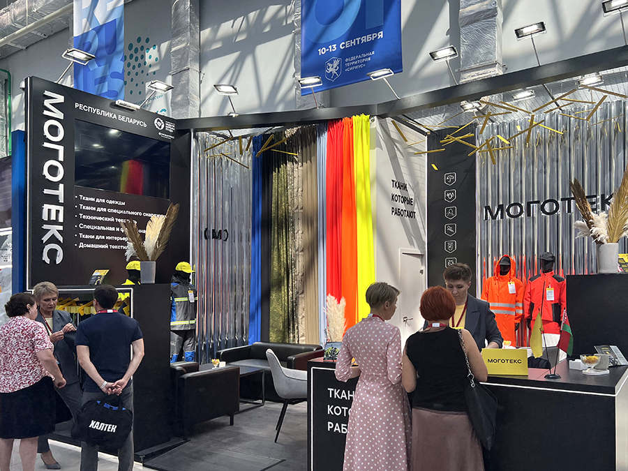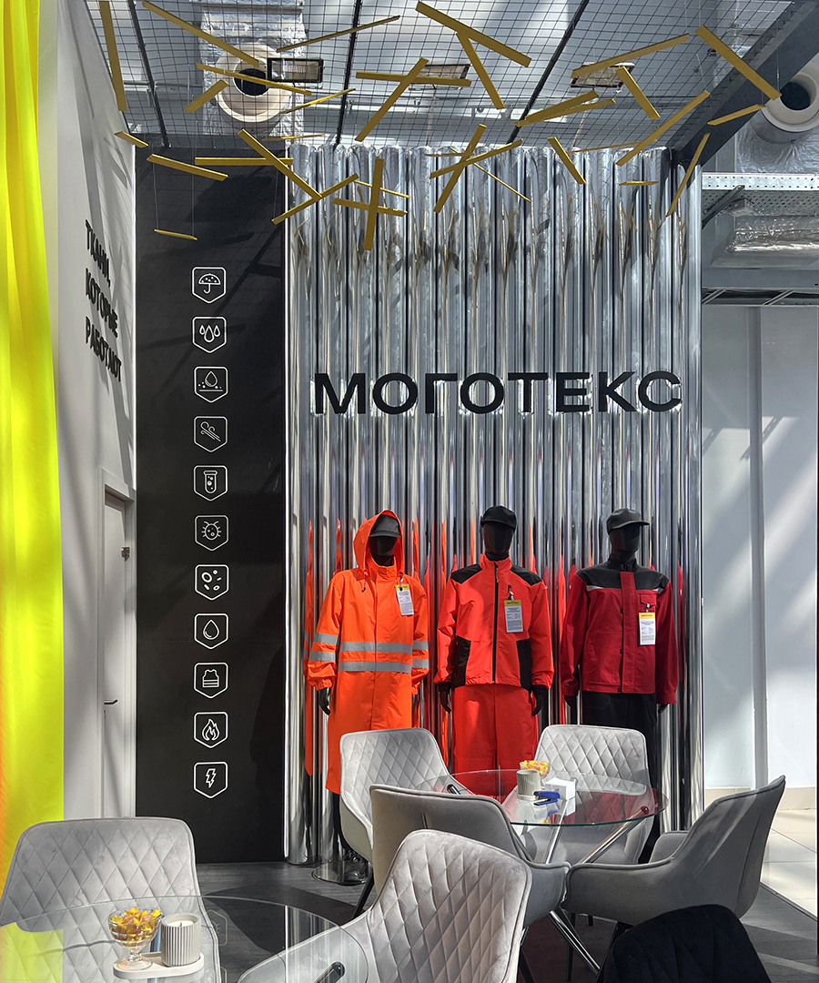 На стенде компания «Моготекс» экспонирует ассортимент тканей для специального назначения, включая  ткани со специальными защитными свойствами, для специального снаряжения, курточные и подкладочные, флуоресцентные. Экспозицию дополняют манекены, на которых демонстрируются специальные костюмы для рабочих, включая комплекты из сигнальных тканей. Также предприятие принимает участие в показе с моделями одежды из тканей для спецназначения (видео показа можно посмотреть по ссылке). Материалы предприятия используются работниками нефтегазовых компаний, подходят для сотрудников, работающих в условиях недостаточной видимости, — автотрассы, ЖД и не только.