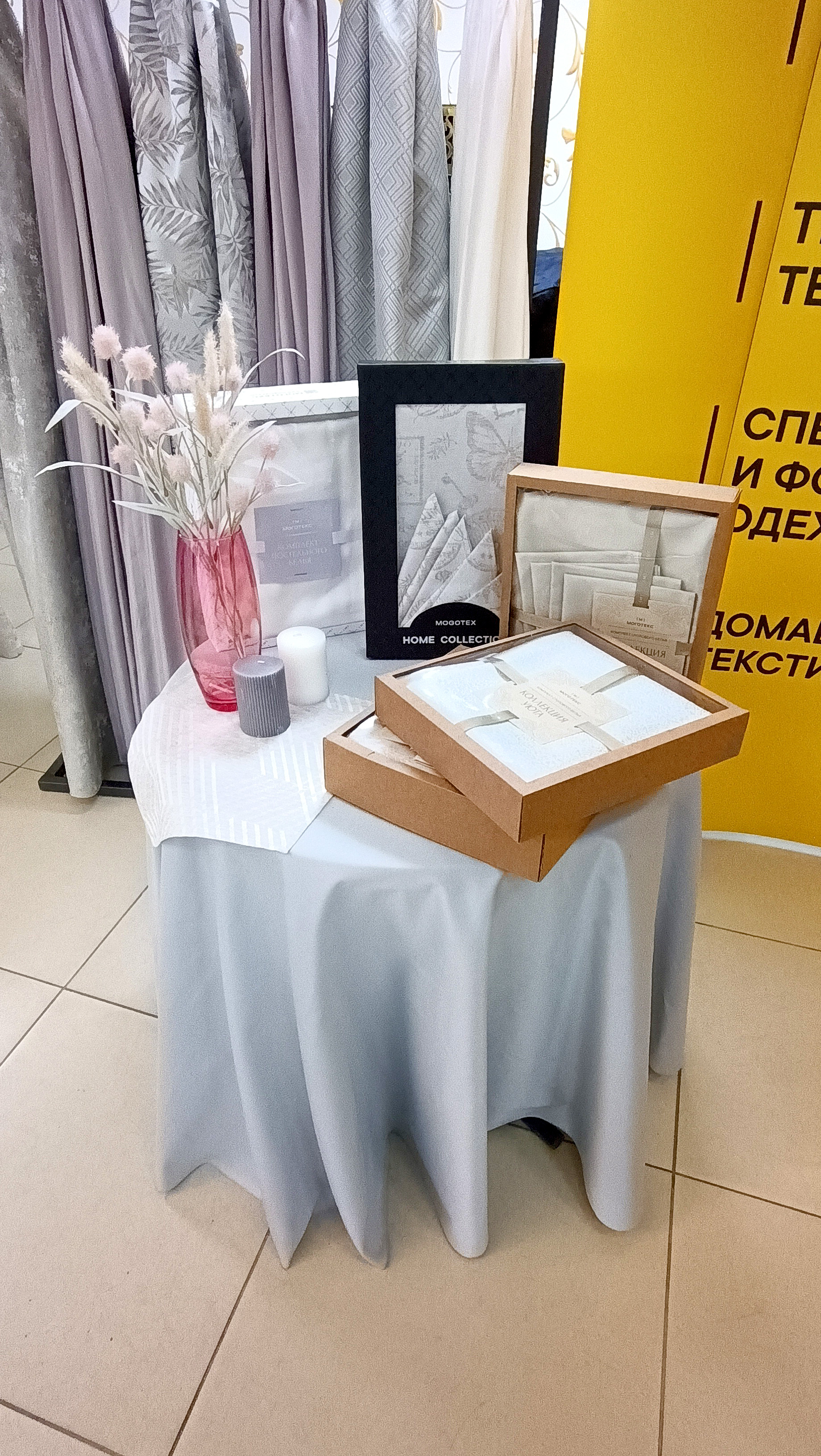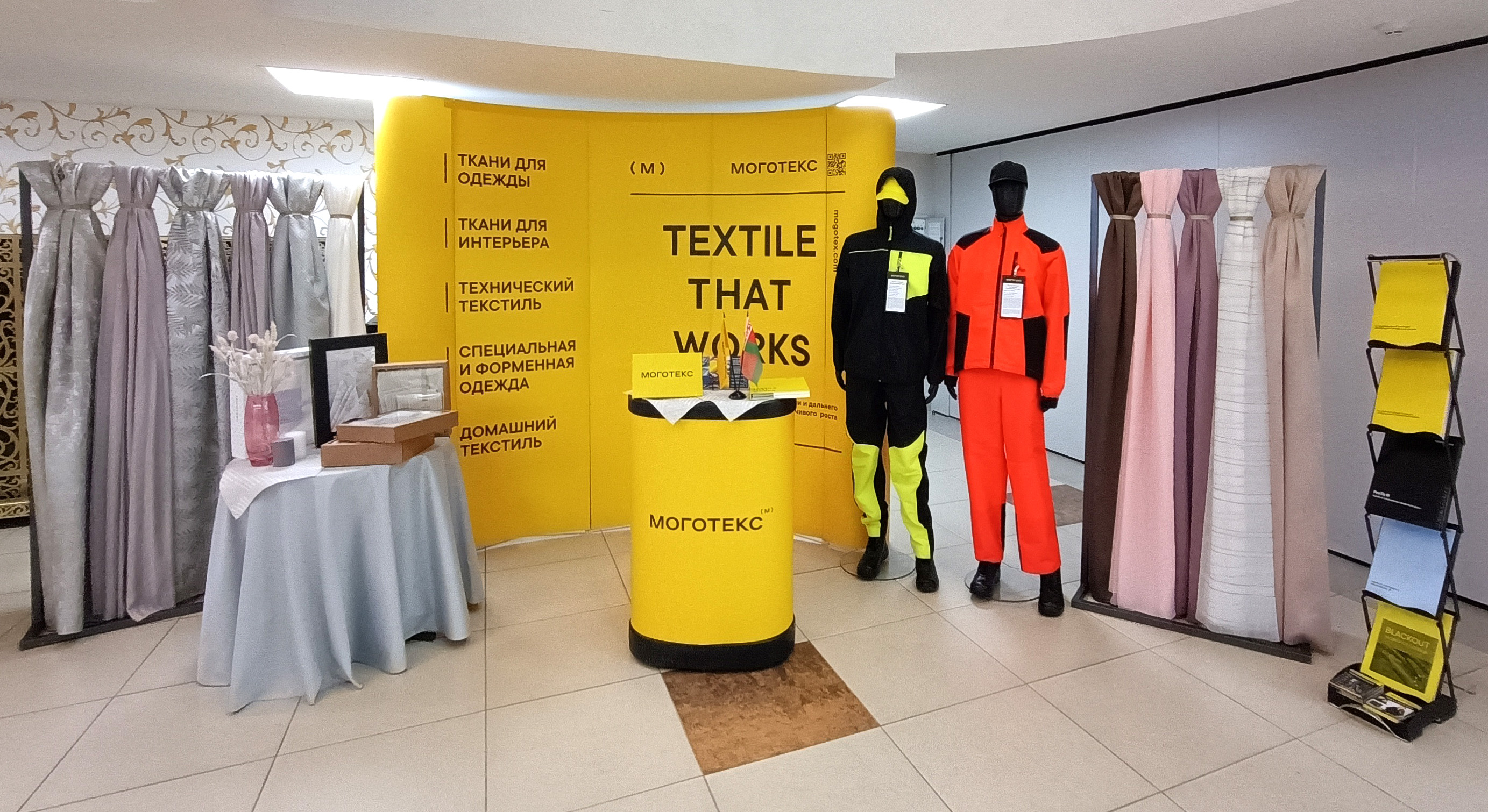 Предприятие продемонстрировало полотна и готовые изделия для оформления интерьера - портьеры, вуали, скатерти, а также постельное белье. На манекенах можно увидеть образцы спецодежды с применением флуоресцентных тканей для работы в условиях плохой видимости.
